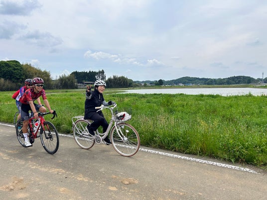 青い空と水田をバックに記念撮影。田園風景の中をサイクリングする清々しさは、若々しさに直結します。