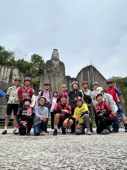 サイクリング目的地の大谷平和観音で記念設営。片道5km往復10kmを全員が完走しました。