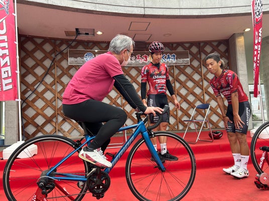 ロードバイクに乗車をいただきながら、自転車運動の効果を宇都宮ブリッツェンの選手が解説