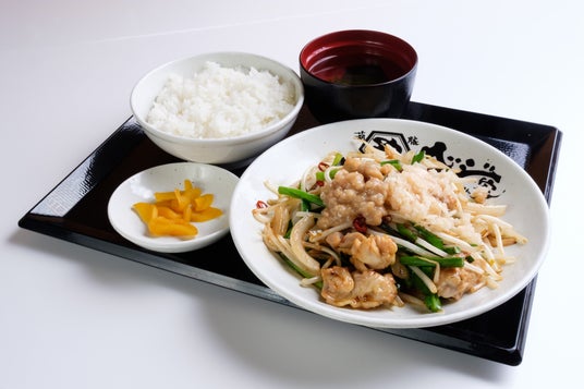 スタミナ炒め定食 ご飯+スープ+漬物+生卵食べ放題付