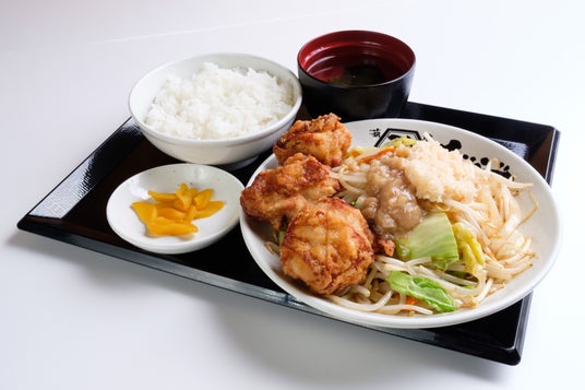 鶏唐炒め定食 ご飯+スープ+漬物+生卵食べ放題付