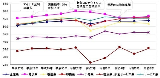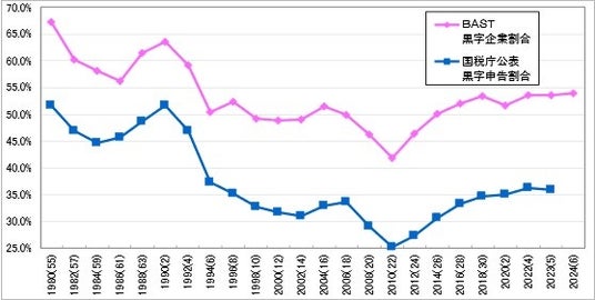 2024年の全産業の黒字企業割合は、前年から0.4ポイント上昇した53.9%でした。