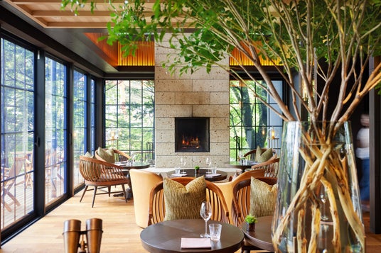 土からこだわって育てた野菜やハーブ、シェフ自らが処理したジビエを使用するなど、真の地産地消を追求。隣接するパン小屋で焼いたパンや富山のお酒とともに、ここでしか創れない前衛的地方料理を楽しめる。敷地内でも最も眺めの良いダイニングは、オープンキッチンを中心に、カウンター、テーブル、個室を配置。2階には受付ロビーとサロン、1階にカーヴを設け、カーヴ前室には開放感のあるテラスも用意。