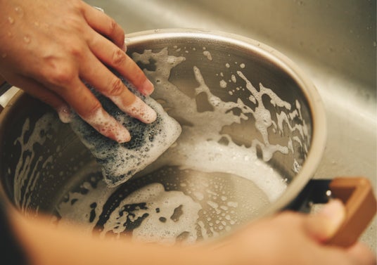これはステンレス表面に微細な凹凸を加工することで、食材が密着しにくくしたもので、食材がこびりつきにくいだけではなく、水に浸け置くだけで汚れがツルンと落ちやすくなります。