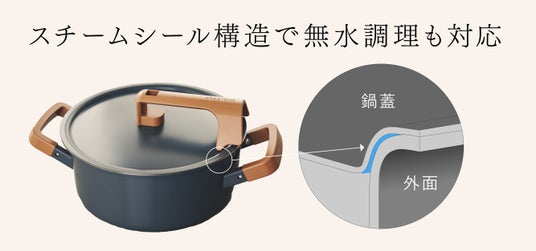 本体と蓋のスチームシール構造により、無水調理にも対応しています(弱火でじっくり調理してください)。