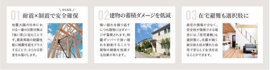 当社ではこれまで、構造躯体の倒壊防止および損傷防止に関する最高等級である、耐震等級3および耐風等級2を標準とし、日本住宅性能表示制度に基づく厳格な自社評価を実施してまいりました。今回の制震装置の追加により、耐震性に加えて「制震」による巨大地震などの揺れを抑制し、より高いレベルの安全性能を実現いたします。