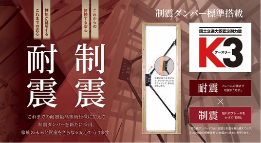 地震や台風などの自然災害の脅威が年々増すなか、住宅に求められる安全性能は「一度の揺れに耐える」だけでなく、「繰り返しの揺れによるダメージを抑え、長く住み続けられる家づくり」へとシフトしています。とくに、首都直下地震や南海トラフ地震など、現実的なリスクとして懸念される大規模災害の存在により、住宅には“強さ”と“しなやかさ”を兼ね備えた構造が求められています。当社は、こうした社会的要請に応えるべく、「耐震×制震」の標準化を決定しました。■制震ダンパー「K3」の特長と性能