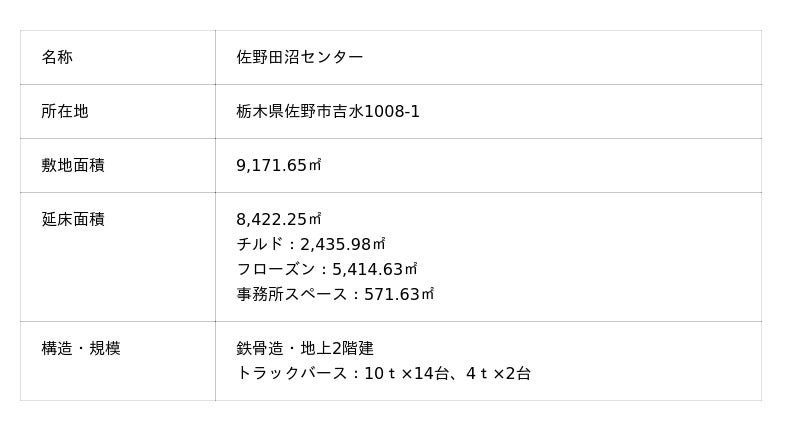 佐野田沼センターは、北関東自動車道・佐野田沼ICから1.1Km、東北自動車道・佐野スマートICから8.4Kmと好立地に位置し、関東圏内への冷凍冷蔵配送に加えて全国から関東に向けた貨物のハブ機能としての強みを持った施設となっています。また、佐野チルドフローズン物流センターまで10Km圏内と近接していることから、倉庫スペース・人員・車両などを繁閑や顧客ニーズに合わせて柔軟に対応することが可能となります。