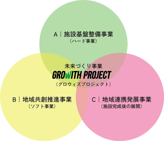 本プロジェクトは、施設整備(A)、地域共創(B)、連携発展(C)の3つの事業で構成されています。 地域との関係構築や発信にも広がるこの複合的な取り組みは、「クラブのため」だけでなく、「まちの未来のため」に進める地域連携プロジェクトです。 市民やファンが関わる過程そのものにも価値を見出し、将来「クラブがいてよかった」と思ってもらえる存在を目指します。