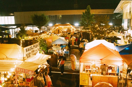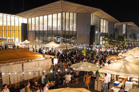 黒磯日用夜市では、小さな子どもたちが楽しめるワークショップも用意されており、ミュージックチャージは中学生以下無料。家族みんなで気軽に楽しめるイベントとなっています。会場は那須塩原市図書館「みるる」前の黒磯駅西口広場と、その周辺の道路を会場とした開放的な空間。日が暮れる頃から賑わいが増し、駅前とは思えない非日常の風景が広がります。