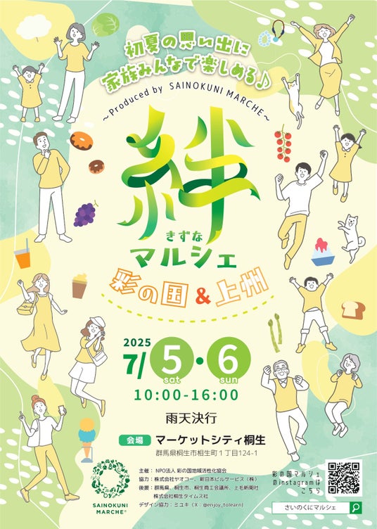 NPO法人 彩の国地域活性化協会(拠点:埼玉県さいたま市、代表理事:佐々木 輝伸)が主催する「彩の国マルシェ」は、2025年7月5日と6日の2日間、群馬県桐生市にあるマーケットシティ桐生にて「絆マルシェ~彩の国&上州~Produced by SAINOKUNI MARCHE~」を開催いたします。