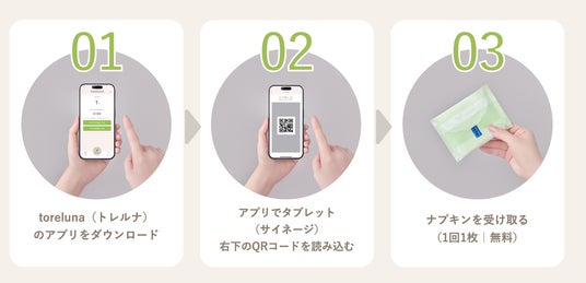 トイレットペーパーと同様に、生理用ナプキンについてもさまざまな施設で無償提供できるようにしたい。そんな想いから本サービスは生まれました。トレルナは、スマートフォンアプリとトイレ内のディスペンサーが連動することで、ナプキンが無料で受け取れるサービスです。トレルナが設置されているトイレ個室に入るとデジタルサイネージにトレルナパートナーの動画が表示され、持続的にサービスを提供できる仕組みとなっています。