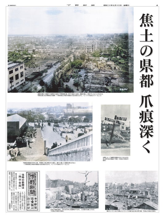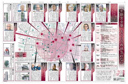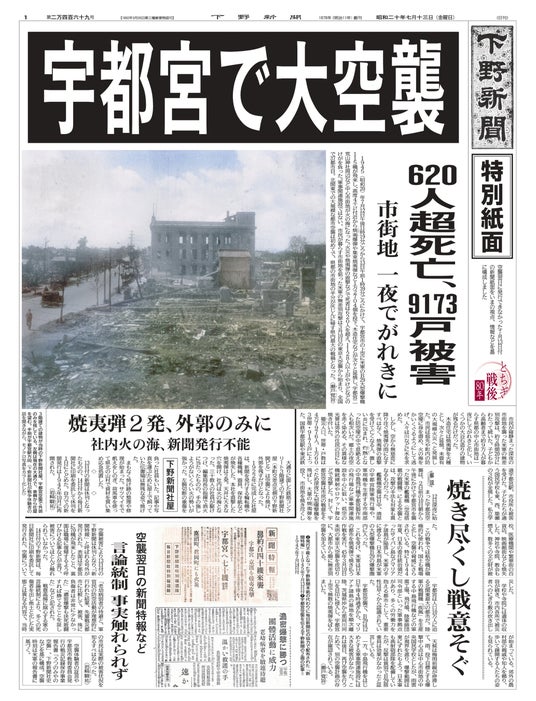 下野新聞社(栃木県宇都宮市昭和1-8-11、若菜英晴代表取締役社長)は7月12日、80年前のその日にあった栃木県の県都・宇都宮市への空襲を伝える特別紙面「宇都宮空襲新聞」を発行しました。社屋が空襲で炎上、翌13日の新聞を発行できなった先人の無念を思い、言論統制下で報じることができなかった苛烈な被害の実相をつぶさに盛り込んでいます。