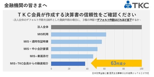 日本政策金融公庫から還元を受けたTKCモニタリング情報サービス(MIS)を利用する企業の貸付状況等のデータを基に、MIS利用先企業の信用リスクを分析しました。その結果、TKC会員からの融資紹介については、大幅にデフォルトが抑制されており、信用リスクが顕著に低いことがわかりました。これはTKC会員が作成する決算書の信頼性の高さを証明するものであり、今回の提携スキームの構築につながりました。