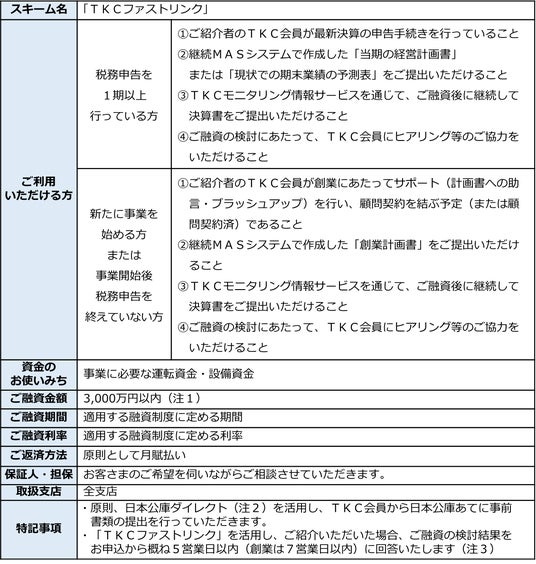 具体的には、「TKCファストリンク」を活用し、TKC会員が紹介した関与先企業については、融資の検討結果を申込みから概ね5営業日以内(創業は7営業日以内)に回答するものです。