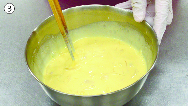 ③ ボウルに卵を割り入れて溶きほぐし、生クリーム、チーズの半量、②、塩・こしょうを加えてよく混ぜ合わせる。