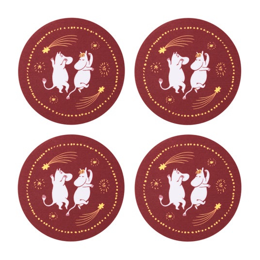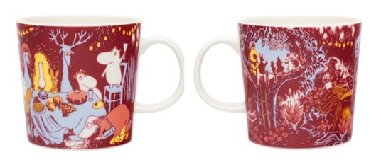 1948年の『たのしいムーミン一家』をもとに、ムーミン アラビアのデザインチームのパルバティ・ピライによってデザインされたこのコレクションは、ボルドーカラーをベースに、淡い赤や温かみのあるイエロー、淡いブルーをアクセントにした豊かな色調で、ムーミン谷の祝祭の雰囲気を印象的に表現しています。ホリデーシーズンにふさわしい世界観で、贈り物としても自宅での特別なひとときを彩るアイテムとしても、ぴったりなコレクションです。