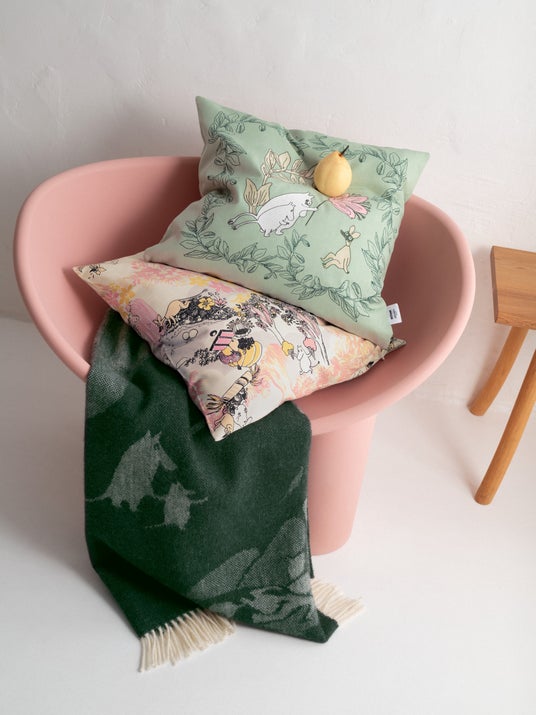 第1弾として、ウールやオーガニックコットンを使用したクッションカバーやストレージバスケット、ブランケットなどを展開。ムーミンの80周年のお祝いとして、デザインには、シリーズの原点である1945年発表のトーベ・ヤンソン原作『小さなトロールと大きな洪水』冒頭の物語を採用しました。