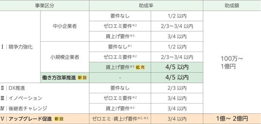 R7年度より新設の「働き方改革推進」区分と、賃上げ要件を適用した「小規模企業者」区分では、助成率を最大4/5以内に拡充します。