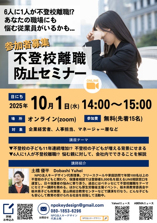 NPO法人キーデザイン(栃木県宇都宮市、代表理事:土橋優平)は、企業の経営者・人事担当者・管理職向けに「不登校離職防止」をテーマとしたオンライン無料セミナーを、2025年10月1日に開催いたします。