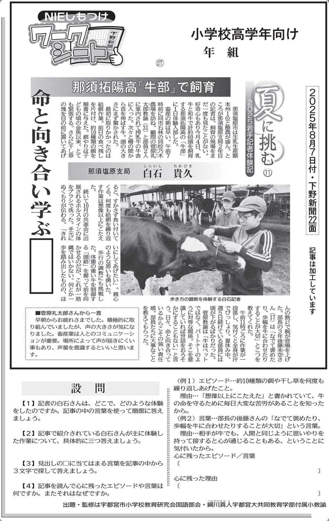 下野新聞の記事を使って社会への関心や読解力を高める「ワークシート」をスタートします。出題するのは、県小・中・高校教育研究会の国語・社会部会に所属する教員たち。ぜひ挑戦してください。