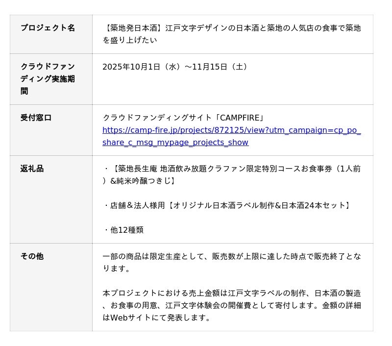 NPO法人つきじ江戸文字と歴史伝承の会が運営する「つきじファン倶楽部」(本社:東京都中央区、理事長:坂本貴男)は築地発の日本酒と人気店の食事で築地を応援!【江戸文字デザインの日本酒】を立ち上げ、その運営資金をクラウドファンディングサイト「CAMPFIRE」にて募集を開始しました。募集期間は、2025年10月1日(水)から11月15日(土)までとなります。