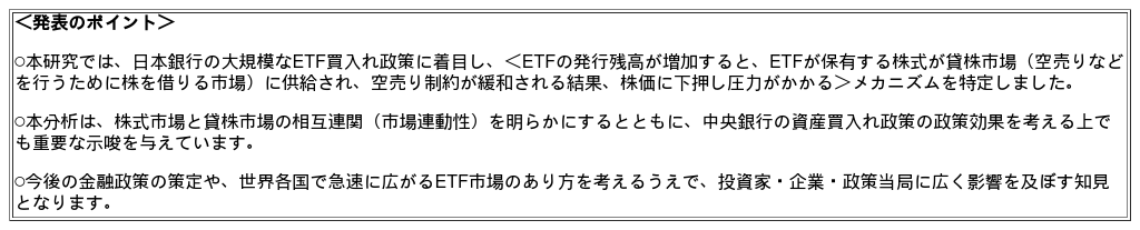 2008年の世界金融危機以降、各国の中央銀行は「非伝統的金融政策」として、さまざまなタイプの金融資産を大規模に買入れる政策を模索してきました。日本銀行は2010年から、TOPIXや日経225などの株価指数に連動するETF(上場投資信託)を大規模に買い入れる政策を実施し、これまでの学術研究では、その効果として株価の押し上げが確認されてきました。しかし、こうした既存研究では主にETFを買い入れることによる直接的な株価押し上げ効果に焦点を当てており、空売りなどを目的に株式を貸し借りする市場(貸株市場)への影響や、空売り制約・貸株料の変動といった要素は分析対象とはなっていませんでした。