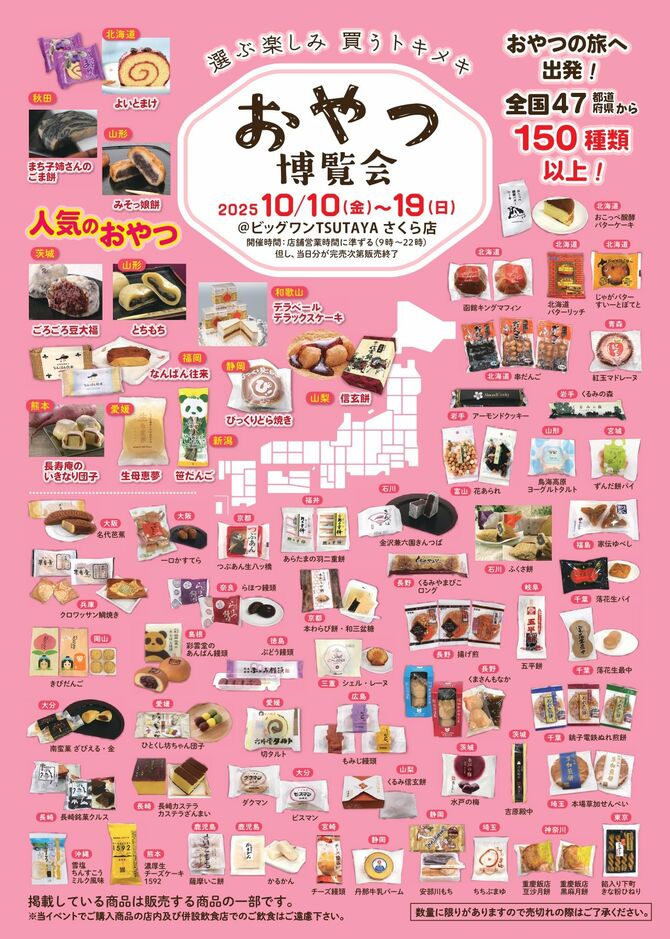 全国のご当地おやつを集めたイベント「おやつ博覧会」が10月10日、栃木県さくら市桜野のビッグワンTSUTAYAさくら店で始まる。栃木県内では初開催。北は北海道から南は九州・沖縄まで、全国47都道府県のご当地人気お菓子150種類以上が大集結する。10月19日まで。