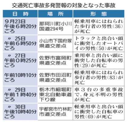 県交通安全対策協議会(会長・福田富一(ふくだとみかず)知事)は3日、交通死亡事故多発警報発令期間中の9月30日に宇都宮市内で交通死亡事故が発生したため、発令期間を7日までに再延長した。9月下旬だけで6件の死亡事故により6人の命が失われており、県警は「近年にない危機的状況」と一層注意喚起している。