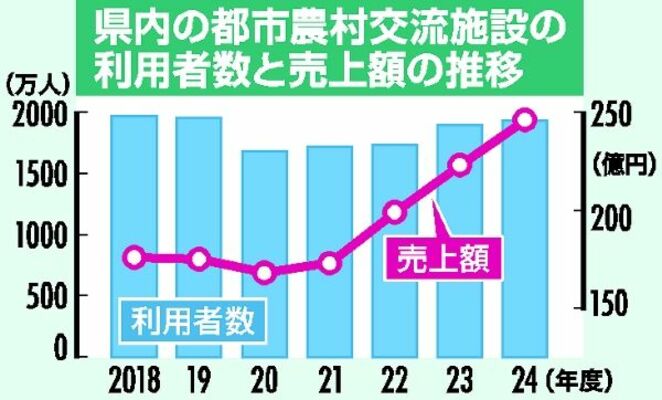農産物直売所や農村レストランなど県内の都市農村交流施設の2024年度の売上額は前年度比10%増の246億円で、3年連続で過去最高を更新したことが3日までに、県農政部のまとめで分かった。地域の特色を生かした新商品開発の他、県の支援を受け運営改善に取り組んだ施設などが好調だった。全体の利用者数は2%増の1929万人。新型コロナウイルス禍前のピークだった18年の1968万人に比べ過去4番目の水準に回復している。