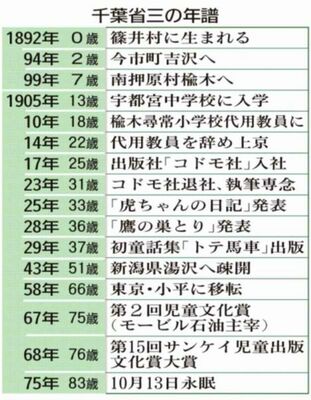 作者は大正から昭和初期に活躍した鹿沼市楡木町出身の児童文学作家千葉省三(ちばしょうぞう)(1892~1975年)。近代の日本文学史上、宮沢賢治(みやざわけんじ)、新美南吉(にいみなんきち)らと並んで、中央で高く評価された。今年10月13日、没後50年を迎える。