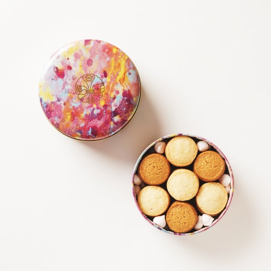 栃木県伝統工芸師、色彩アーティストの西形彩の染織物を配したコラボレーション缶。チーズとメープルの2種をアソートにしました。ピンクのメレンゲが彩りを加えます。