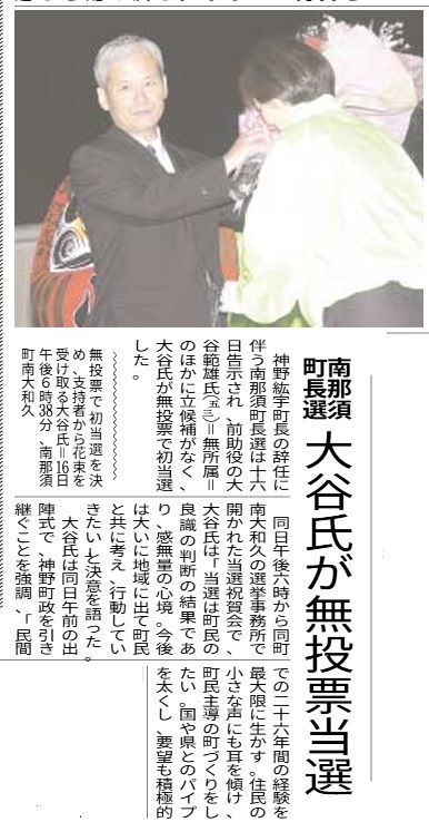 南那須町長選 大谷氏が無投票当選(2001年10月17日)