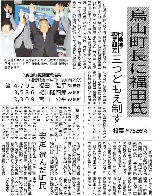 烏山町長に福田氏 他候補に1000票超差 三つどもえ制す 投票率75.86%    (2002年4月16日付)