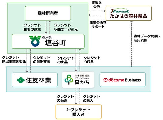 こうした課題を解決するため4者は連携協定を締結しました。塩谷町がプロジェクト管理者として多数の所有者にまたがる小規模森林を一つのプロジェクトにまとめ、クレジットを創出します。「森かち」のプラットフォームと住友林業のコンサルティングサービスで合意形成の負担軽減、データ管理の効率化、クレジット発行に係る手続きを支援します。