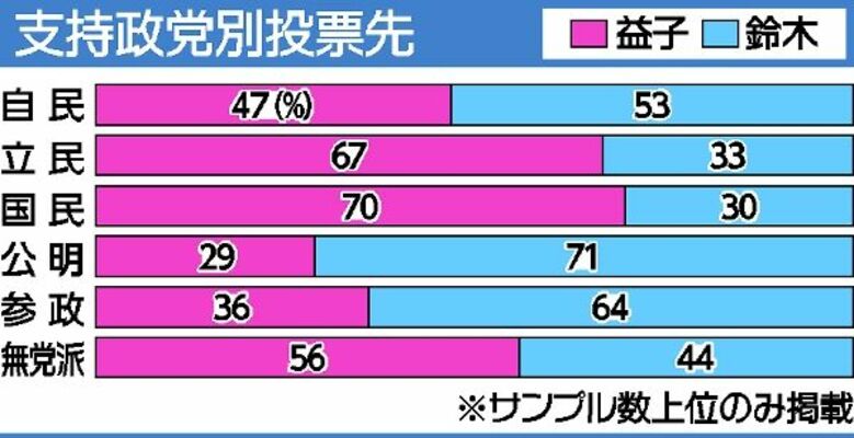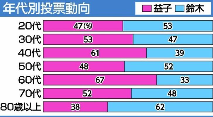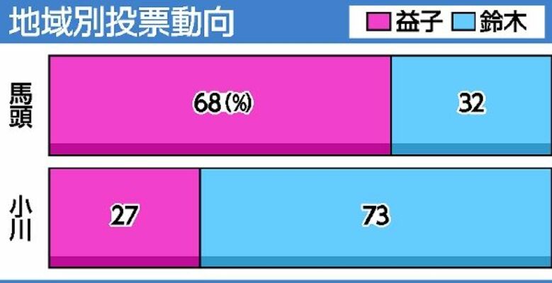 【那珂川】いずれも無所属新人で前町議の益子純恵(ましこすみえ)氏(46)と鈴木繁(すずきしげる)氏(61)が激しい一騎打ちを展開した19日投開票の町長選で、下野新聞社は出口調査を実施し、計390人から回答を得た。益子氏の地盤である馬頭地区、鈴木氏が地盤とする小川地区の旧2町で支持傾向がはっきりと分かれ、人口比がそのまま勝敗を左右したとみられる。