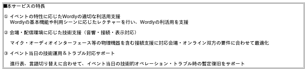 昨今、国際イベントでの多言語対応ニーズの高まりを受け、AIリアルタイム翻訳ソリューションの導入が進んでいます。Wordlyは、通訳者の手配等の事前準備にかかる負荷やコストを抑えられる点に加え、参加者がそれぞれの母国語で会話を理解できる「多言語同時翻訳」機能が高く評価されています。さらに音声認識の精度が高い点も評価され、導入企業が増加しています。一方で、コロナ禍を経てオフラインイベントが再び活発化する中、音響・映像機器や配信システムの設計・運用等、現場で求められる技術的な対応は複雑化しており、Wordlyの導入だけでは同時通訳を含むイベント全体の安定的な運用は難しい状況にあります。