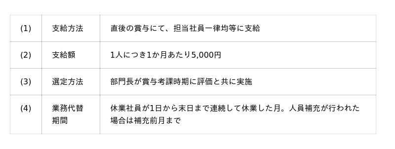 育児休業や介護休業など、長期休職を取得する社員が所属する部門では、休職者の業務を他の社員が代替する必要があります。代替業務を負担する社員に対して手当を支給することにより、社員の育児休業や介護休業取得を支援します。