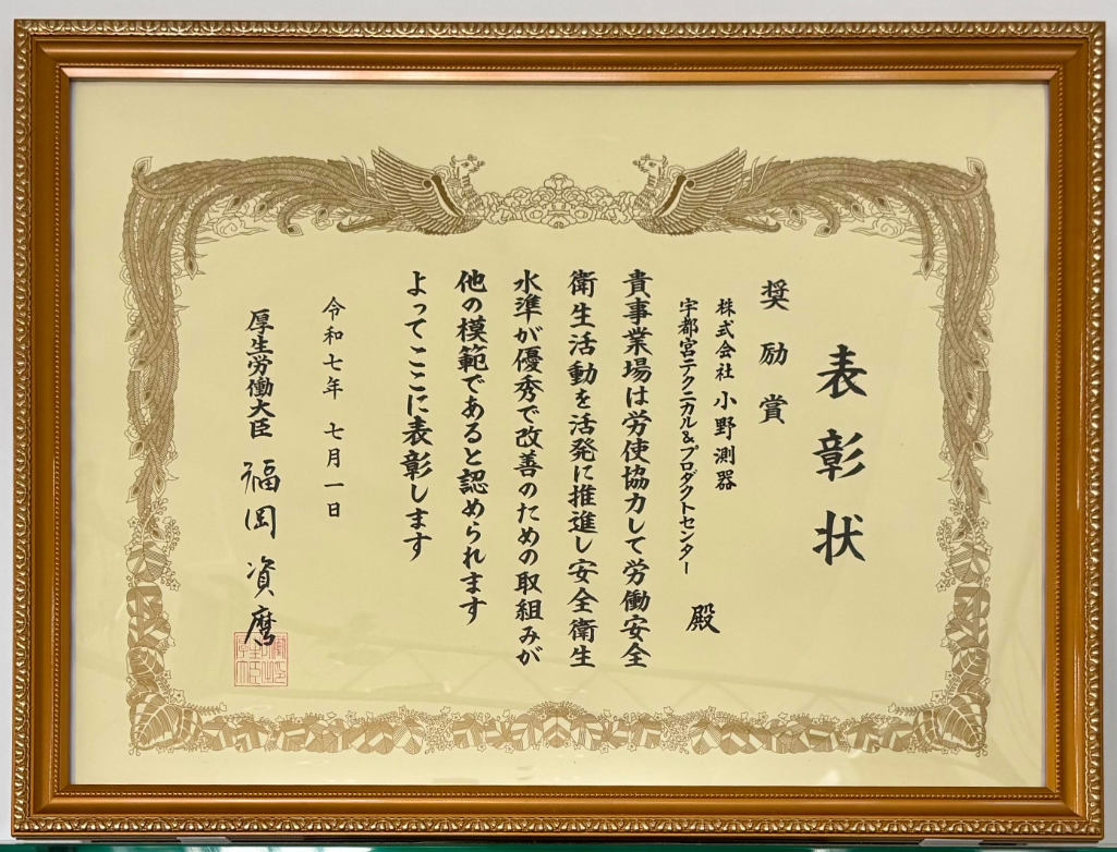 - 小野測器の拠点「宇都宮テクニカル&プロダクトセンター」が厚生労働大臣表彰・奨励賞授与- 同拠点が操業以来推進する安全への取り組みが評価
