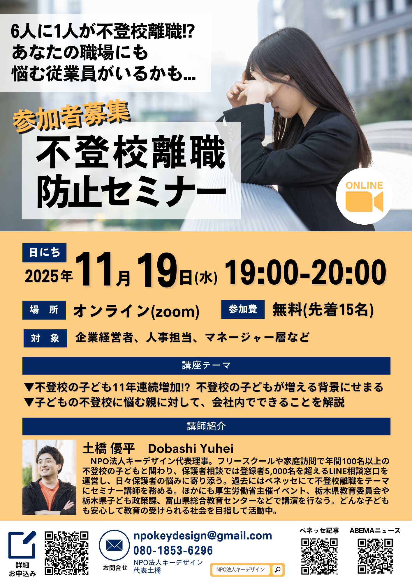 NPO法人キーデザイン(栃木県宇都宮市、代表理事:土橋優平)は、企業の経営者・人事担当者・管理職向けに「不登校離職防止」をテーマとしたオンライン無料セミナーを、2025年11月19日に開催いたします。