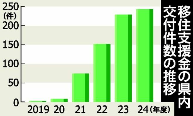 東京23区に在住・通勤する人が東京圏(東京・埼玉・千葉・神奈川)外に移住した際に支給される「移住支援金」で、2024年度の県内の交付件数は前年度比14件増の243件となり、過去最多を更新したことが31日までに、県への取材で分かった。テレワーカーの移住が堅調で、特に子育て世代が増加傾向にある。交付額は約1億円増の3億8800万円だった。