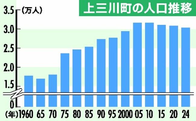 【上三川】町の10月1日現在の推計人口は前月比66人減の2万9991人(男1万5546人、女1万4445人)で、24年ぶりに3万人を割り込んだことが31日、町などへの取材で分かった。町の人口は町内への工場誘致などを背景に1965年から増加したが、2010年の3万1621人をピークに緩やかに減少している。出生数から死亡数を差し引いた自然動態が昨年は129人減となるなど少子高齢化が影響している。町は一定の減少を前提としつつ、子育て環境の充実などに力を入れ、減少ペースの緩和を図っている。