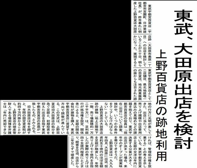 ■東武、大田原出店を検討 上野百貨店の跡地利用(2001年10月1日)