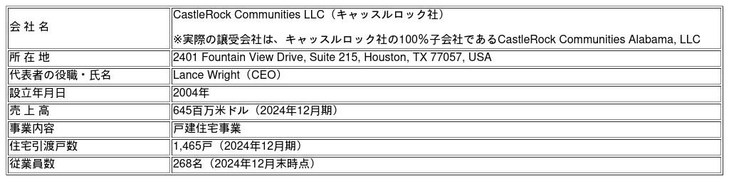 そしてこのたび、キャッスルロック社は、さらなる事業拡大を目指し、アラバマ州ハンツビルを中心に事業を展開するレン社の戸建住宅事業を譲受することとしました。