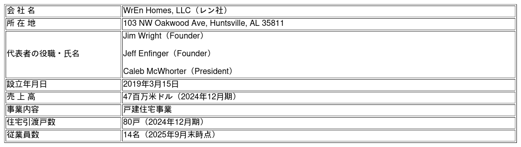 レン社は、米国アラバマ州ハンツビル地域を中心に住宅の建設、販売を行う戸建住宅会社です。買替層向けの高価格帯商品を中心に展開しており、2024年度の年間引渡戸数は80戸です。