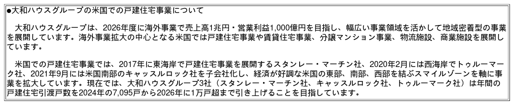 今後、テキサス州で一次取得者向けの商品供給に強みを持つキャッスルロック社は、買替層向けの商品を中心に展開するレン社の戸建住宅事業を譲受し、同社の有する戸建住宅商品のデザインや営業手法などのノウハウを取得することで、さらなる規模拡大が期待できます。