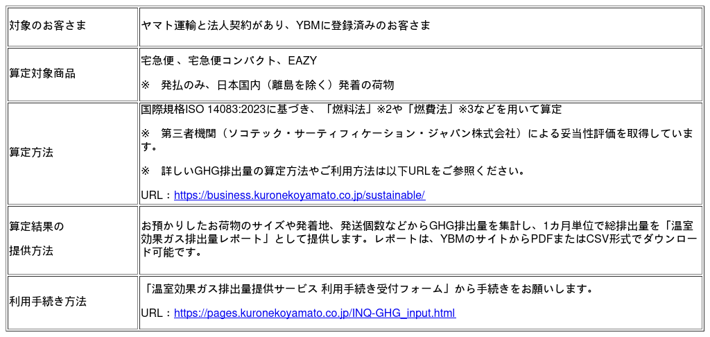 ヤマト運輸株式会社(本社:東京都中央区、代表取締役社長:阿波 誠一、以下:ヤマト運輸)は、2025年11月18日(火)から法人向け会員サービス「ヤマトビジネスメンバーズ(以下:YBM)」に登録いただいている法人のお客さまを対象に、宅急便などの輸配送工程で生じた温室効果ガス(以下:GHG)排出量を算定する「温室効果ガス排出量提供サービス」を開始します。本サービスの算定方法は、国際規格ISO 14083:2023※1に準拠しているため、より実態に即したGHG排出量の算定が可能です。さらに、算定プロセスを自動化しているため、算定申込後、最短2営業日で算定結果の提供が可能です。