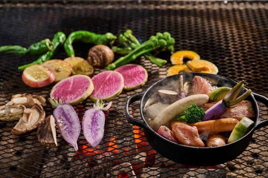 ~炭火で焼き上げたグリル野菜や、根菜たっぷりの鍋など、那須連山の雪景色を独占する特別席で出来立ての料理を堪能する~