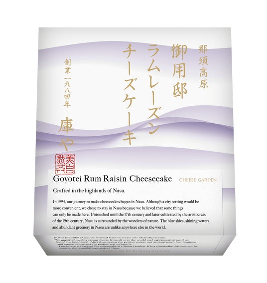 『御用邸ラムレーズンチーズケーキ』は、2023年初冬に登場した、チーズガーデンでは珍しいお酒を使用した大人の味わいが楽しめる商品です。数種類のチーズをブレンドした生地に、小粒でありながら濃い味わいがお楽しみいただけるカレンズを混ぜ込み、ラム酒パウダーを配合した、リッチで深みのある味わいのベイクドチーズケーキです。コクのあるチーズのミルク感と芳醇なラムの香り、レーズンの優しい甘みと酸味などが織りなす、チーズとラムレーズンのマリアージュがお楽しみいただけます。