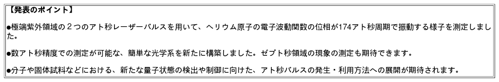 本研究で用いたヘリウム原子の4pリドベルグ状態では、電子波動関数の位相変化は174アト秒周期ですが、測定の精度は数アト秒以下も可能です。そこで、数アト秒からゼプト秒で生じる新たな物理現象を発見し、測定することが今後の課題となります。